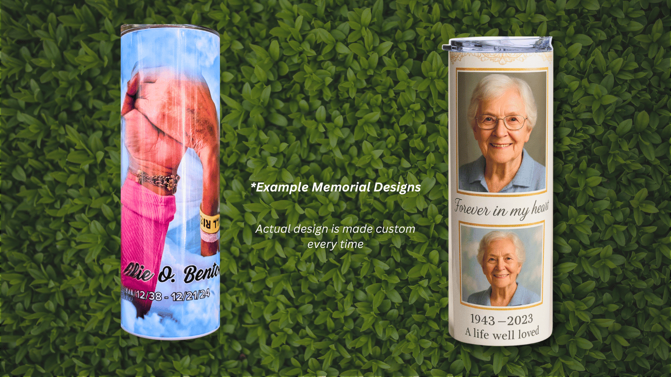 Our memorial keepsake tumblers are custom-designed using a loved one's photo, name and dates. Each piece is created with intention and respect, offering a tangible way to remember, reflect and feel close.